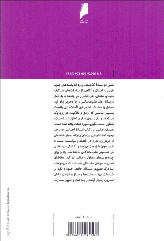 هدف اصلي اين کتاب اشاره اجمالي به برخي وجوه تجدد خواهي ايرانيان و ارائه بسيار خلاصه اي از خردورزي مدرن در اقتصاد و سياست است تا شايد بتوان با زدودن ابهام ها و آشفتگي هاي فکري در خصوص عقب ماندگي جامعه ما ، راه را براي چاره جويي هاي معقول و موثر باز کرد. مخاطبان اصلي ما جوانان مشتاقي هستند که مي خواهند با درک عميق تر مسائل جامعه خود و تکيه بر شناخت بهتر انديشه ها و سازو کارهاي دنياي امروز ، ايران آينده را با عقل و تدبير بسازند.