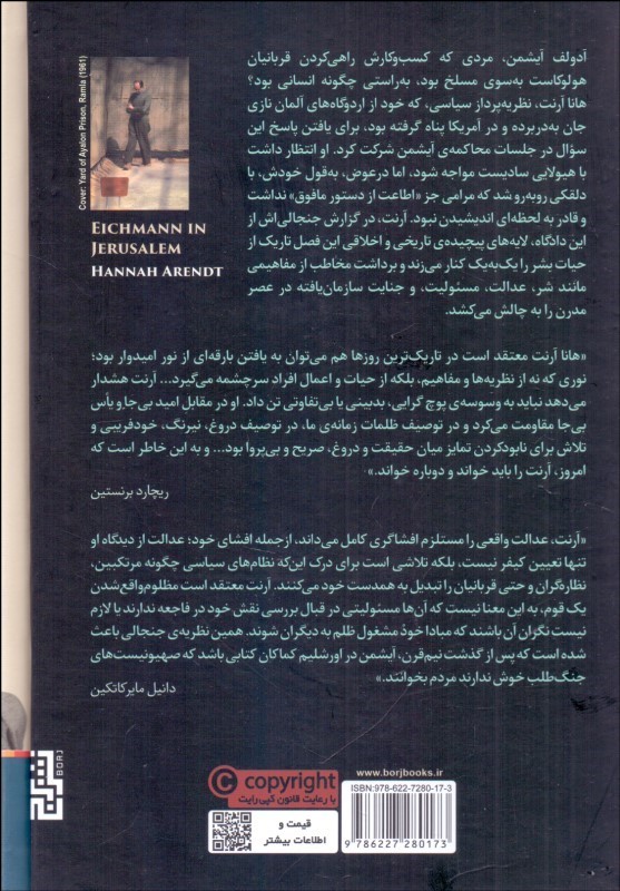 آيشمن در اورشليم (گالينگور) ناشر: نشر برج مترجم: زهرا شمس نويسنده: هانا آرنت قطع: رقعي نوع جلد: گالينگور زبان: فارسي تعداد صفحات: 374 سال انتشار: 1404 نوبت چاپ: 45 وزن: 460 شابک: 9786227280173 قيمت: 500,000تومان موجودي : موجود نیست به من اطلاع بده افزودن به علاقهمندیها به اشتراک بگذارید نظرات محل درج نظر کاربران... کتابهای مرتبط با موضوع کتاب 20% شهريار 300,000تومان 240,000تومان 20% مقدمهاي بر تحليل سياسي 140,000تومان 112,000تومان 20% فهم نظريههاي سياسي 280,000تومان 224,000تومان توسعه در مكاتب متعارض 290,000تومان تاريخ تحول دولت در اسلام 380,000تومان تاريخ ديپلماسي و روابط... 350,000تومان جنگ اوكراين و دورنماي... 100,000تومان 20% مدرنيته سياسي 495,000تومان 396,000تومان از بحران تا فروپاشي (ك... 120,000تومان روابط خارجي ايران (دول... 420,000تومان همراه اين کتاب خريداری شده خرد جمعي 255,000تومان مرواريد 150,000تومان وراي ممكن 99,000تومان اروپا از دوران ناپلئون... 1,200,000تومان زمين نوآباد (2 جلدي) 650,000تومان ربكا (عاشقانههاي كلاسيك) 525,000تومان رولان بارت (انديشهگرا... 69,000تومان دزيره (2 جلدي) 690,000تومان