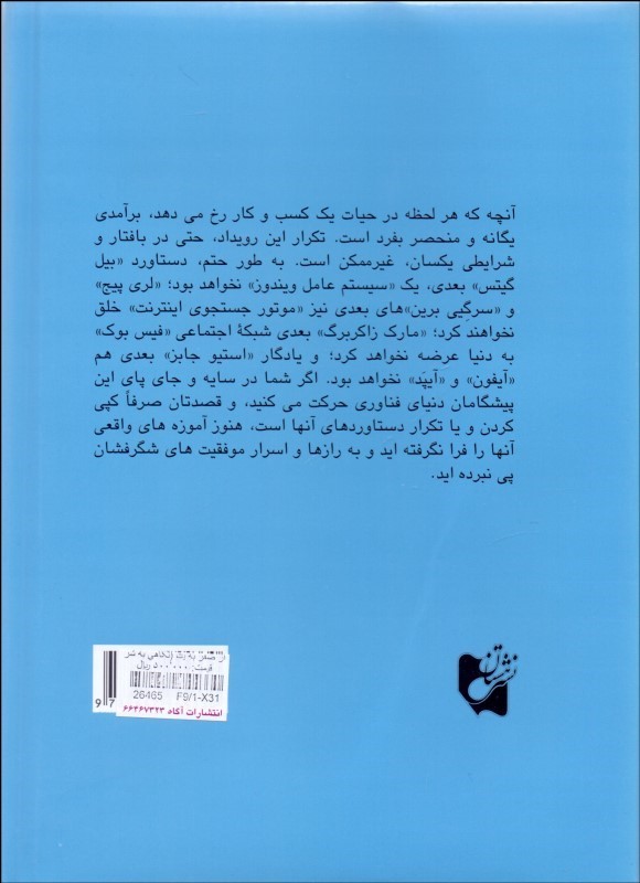 از صفر به يك (نگاهي به شركتهاي استارتاپ در سيليكان ولي و نقش آنها در تجسم آينده) ناشر: هستان مترجم: حسين راسي نويسنده: پيتر تيل قطع: وزيري نوع جلد: شوميز زبان: فارسي تعداد صفحات: 270 سال انتشار: 1397 نوبت چاپ: 4 وزن: 660 شابک: 9789642944330 قيمت: 50,000تومان موجودي : موجود نیست به من اطلاع بده افزودن به علاقهمندیها به اشتراک بگذارید نظرات محل درج نظر کاربران... کتابهای مرتبط با موضوع کتاب 20% مديريت رفتار سازماني پ... 830,000تومان 664,000تومان مديريت فروشگاه چيدمان... 290,000تومان مباني مهندسي مالي و مد... 700,000تومان تئوري سازمان (ساختار و... 500,000تومان سازمان استراتژي محور 350,000تومان فرامين و فنون تفكر است... 119,000تومان قواعد استراتژي (5 آموز... 23,000تومان مديريت استراتژيك توزيع... 45,000تومان اصول و فنون مذاكره 380,000تومان استراتژي رقابتي (تكنيك... 480,000تومان همراه اين کتاب خريداری شده بووار و پكوشه 30,000تومان نبايدهاي كسبوكارهاي ك... 8,000تومان مديريت نوآوريهاي فناو... 104,500تومان راهاندازي كسب و كار (... 486,000تومان كوه پنجم 320,000تومان ايده عالي مستدام (چگون... 478,000تومان ساختن يك نام تجاري در... 296,000تومان مجموعه استانداردهاي مد... 20,000تومان بازاريابي بيمه 10,000تومان مجموعه قوانين و مقررات... 1,200تومان بازارياب بيمه (اصول و... 8,000تومان 22 قانون ابدي بازاريابي 90,000تومان قبله عالم (ژئوپليتيك ا... 590,000تومان طرح كسب و كار 120,000تومان ده اشتباه نابخشودني در... 7,300تومان