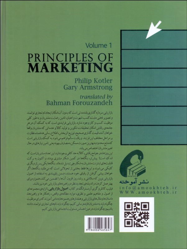( ترجمهي ويراست جديد کتاب اصول بازاريابي در دو شکل تکجلدي و دوجلدي منتشر شده است. در نسخهي دوجلدي همهي مطالب شامل مطالعات موردي، تصاوير، پيوستها و برخي از بخشهاي تکميلي انتهايي فصول نيز وجود دارد. به منظور خلاصهسازي، از آوردن اين بخشها در نسخهي تکجلدي خودداري شده است. علاقهمندان ميتوانند بر حسب نياز و هدف خود هر يک از اين دو مجموعه را که مايل هستند مطالعه کنند.)