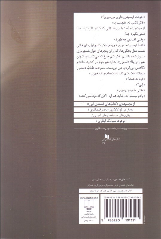 با تو سقوط ميكنم ناشر: چشمه نويسنده: سارا نظري قطع: رقعي نوع جلد: شوميز زبان: فارسي تعداد صفحات: 228 سال انتشار: 1404 نوبت چاپ: 2 وزن: 240 شابک: 9786220101321 قيمت: 330,000تومان موجودي : 1 (جلد) تعداد: − + افزودن به سبد Modal title افزودن به علاقهمندیها به اشتراک بگذارید نظرات محل درج نظر کاربران... , 30/05/1400 05:59 ب.ظ از: راضیه دختری در حادثهای در کوهنوردی، خواهر کوچک خود را از دست میدهد و این سبب شروع ماجرا میشود. فقدان "پگاه" سبب سر باز کردن رنجها و وقایعی در خانواده میشود که تا پیش از آن پنهان بوده است. درواقع "نظری" در این اثر به اوضاع سوگواران در مرگ عزیزانشان و نوع برخورد و مواجهی هریک از آنها با این اتفاق و نیز برخورد افراد دیگر با این سوگواران و سوگ آنها میپردازد. آیا این بررسی مفید بود؟ 0 0 کتابهای مرتبط با موضوع کتاب داستانهاي ناتمام 290,000تومان 20% رنو 5 15,000تومان 12,000تومان پسرخالههاي چايينخورده 30,000تومان آشفته حالان بيداربخت 275,000تومان يك روز مانده به عيد پاك 180,000تومان 20% بريدگي (رمان/ راوي 1) 22,000تومان 17,600تومان 20% تريو تهران 40,000تومان 32,000تومان شازده احتجاب 190,000تومان سمفوني مردگان 420,000تومان 20% زار 160,000تومان 128,000تومان همراه اين کتاب خريداری شده فيليپ كاتلر به سوالات... 35,000تومان ضماير 195,000تومان 20% اعتياد و قاچاق مواد مخدر 3,500تومان 2,800تومان