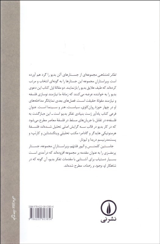 تفكر نامتناهي (حقيقت و بازگشت به فلسفه) ناشر: نشر ني مترجم: صالح نجفي نويسنده: آلن بديو قطع: رقعي نوع جلد: شوميز زبان: فارسي تعداد صفحات: 240 سال انتشار: 1400 نوبت چاپ: 1 وزن: 285 شابک: 9786220603856 قيمت: 98,000تومان موجودي : موجود نیست به من اطلاع بده افزودن به علاقهمندیها به اشتراک بگذارید نظرات محل درج نظر کاربران... کتابهای مرتبط با موضوع کتاب 20% چنين گفت زرتشت (شوميز) 535,000تومان 428,000تومان 20% غروب بتها 255,000تومان 204,000تومان 20% تبارشناسي اخلاق 300,000تومان 240,000تومان منطق يا فن انديشيدن (... 310,000تومان شما بيشماريد 69,000تومان درباره طبيعت انسان 180,000تومان قمار عاشقانه شمس و مولانا 380,000تومان 20% روشننگري چيست؟ روشني... 250,000تومان 200,000تومان فراسوي نيك و بد (پيش د... 460,000تومان 20% نيچه 2 450,000تومان 360,000تومان 20% فلسفه كانت (بيداري از... 685,000تومان 548,000تومان 20% گذار از مدرنيته (نيچه... 300,000تومان 240,000تومان 20% سوسياليسم (درآمدي كوتاه) 130,000تومان 104,000تومان دوازده نظريه درباره طب... 850,000تومان رساله الهي سياسي 850,000تومان منطق صوري 390,000تومان نظم گفتار (درس افتتاحي... 170,000تومان 20% آرمانشهر (يوتوپيا) 180,000تومان 144,000تومان 20% بازگشت به اسپينوزا (بد... 210,000تومان 168,000تومان 20% ماركس (فيلسوفان بزرگ) 99,000تومان 79,200تومان همراه اين کتاب خريداری شده فراسياست (درباره سياست... 320,000تومان بدن تكه تكه شده ( قطعه... 117,000تومان درآمدي بر فلسفه كانت 195,000تومان آنارشيسم 480,000تومان فلسفه تراژدي (از افلاط... 350,000تومان اين قرن 155,000تومان متعلقات و ملحقات (مجمو... 580,000تومان قدرت انديشه 250,000تومان جامعهشناسي بدن 220,000تومان بايد از جامعه دفاع كرد... 130,000تومان كارل ماركس 320,000تومان موجها 335,000تومان بازگشت به آينده 48,000تومان زبان اصالت در ايدئولوژ... 260,000تومان بدن به مثابه شي سينمايي 31,000تومان