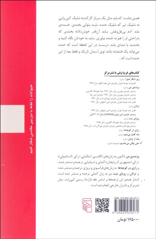 همينجاست که بايد مثل يک سرباز کار کشته شليک کني ولي نه شليک تير که شليک خنده. بايد بتواني بخندي. خندهي بلند آدم بيغلوغش. بايد آنقدر خوشدلانه بخندي که به راحتي او را هم به خنده بياوري. بايد به خودتان نگاه کنيد و بخنديد با صداي بلند. درست در اين لحظه است که خنده ميتواند يک فشفشه باشد توي آسمان تاريک و فقط بعد از اين خنده است که...