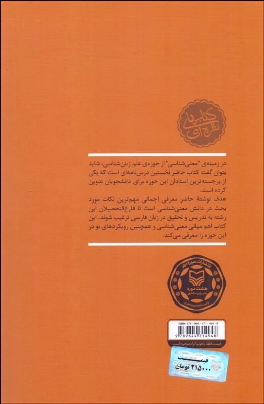 اين کتاب که در زمينة معنيشناسي از حوزه علم زبانشناسي، نخستين درسنامه است که براي دانشجويان فارسيزبان توسط يکي از برجستهترين استادان اين حوزه تدوين شده است. هدف نوشته حاضر معرفي اجمالي مهمترين نکات مورد بحث در دانش معنيشناسي است. در اين کتاب، نمونهها اغلب از زبان فارسي است تا فارغالتحصيلان اين رشته به تدريس و تحقيق در زبان فارسي ترغيب شوند. اين کتاب اهمّ مباني معنيشناسي و همچنين رويکردهاي نو در اين حوزه را معرفي ميکند و پس از استقبال فراوان، براي دومين بار تجديد چاپ شده است. در اين کتاب استفاده از آراي غربيان در زمينة معني، از افلاطون گرفته تا نظريههاي معنايي فرث، فيلمور، چيف و غيره در قرن بيستم و نزديک به آن به معنيشناسي و آراي ايرانيان از سيبويه و ابنسينا گرفته تا جرجاني و تفتازاني و صدها متفکر ديگر اين مرز و بوم پرداخته شده است. در فصل نخستين به مباني نظريه معنيشناسي اينکه معنيشناسي چيست پرداخته شده و در فصل دوم به حوزة مطالعة معني و در فصل سوم به زبان و انديشه، فرضيه زبان و انديشه و در فصل چهارم به روابط مفهومي در سطح واژه به هممعنايي و همآوايي و در فصل پنجم به روابط معنايي در سطح جمله بسنده شده است. فصل ششم معنيشناسي کاربردي و فصل هفتم حوزههاي معنايي را شکافته است. فصل هشتم مربوط به دلالت چندگانه، ابهام و ايهام اختصاص يافته و در فصل نهم به همنشيني معنايي و در فصل ده هم به جانشيني معنايي پرداخته است. فصل يازده هم مؤلفههاي معنايي و فصل دوازدهم معنيشناسي منطقي، رهيافت ارجاعي، قاعدهبندي روابط مفهومي و در فصل سيزدهم معنيشناسي شناختي مورد بحث قرار گرفته است. کتابنامه و نمايه از آذينبندي آخر کتاب است که به دانشجويان کمک ميکند تا به نويسندگان کتابهايي در اين مورد بيشتر آشنا شوند. دکتر صفوي در پايان مقدمهاش آورده است، هنوز در اين فکرم که چرا وقتي سيبي روي سر نيوتن افتاد، او را به کشف قانون جاذبة عمومي راه نمود و چرا اگر صدها هندوانه بر سر من فرود آيند حتي براي يکي از پرسشهايم جوابي نمييابم.