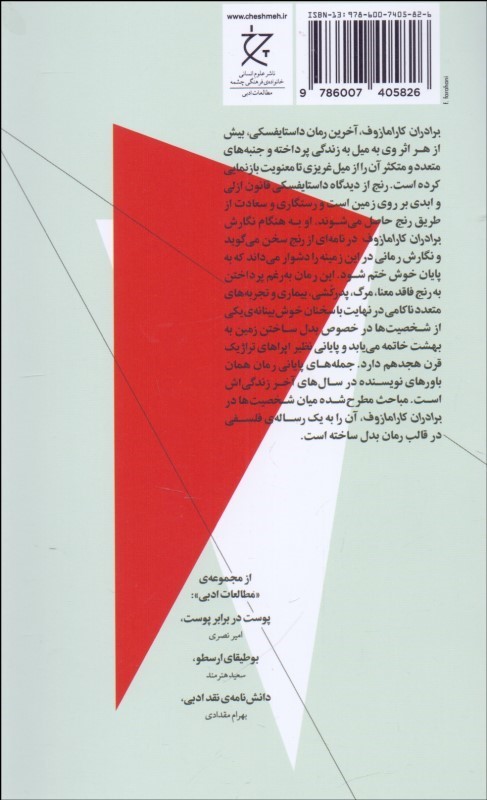 در آغاز رنج بود (خوانش برادران كامازوف) ناشر: چرخ نويسنده: امير نصري قطع: رقعي نوع جلد: شوميز زبان: فارسي تعداد صفحات: 294 سال انتشار: 1403 نوبت چاپ: 3 وزن: 280 شابک: 9786007405826 قيمت: 350,000تومان موجودي : 2 (جلد) تعداد: − + افزودن به سبد Modal title افزودن به علاقهمندیها به اشتراک بگذارید نظرات محل درج نظر کاربران... کتابهای مرتبط با موضوع کتاب نشانهشناسي (نظريه و عمل) 295,000تومان گزيده اشعار خاقاني شرواني 320,000تومان 20% شاعر آينهها (بررسي سب... 350,000تومان 280,000تومان كندوكاوي در پارهاي از... 8,000تومان 20% چگونه شعر بخوانيم 265,000تومان 212,000تومان 20% يادداشتهايي درباره كافكا 90,000تومان 72,000تومان بيان و معاني 250,000تومان حماسه رستم و سهراب 360,000تومان تاريخ ادبيات ايران و ق... 310,000تومان كتاب كار نگارش و انشا 2 200,000تومان همراه اين کتاب خريداری شده تو هماني كه ميانديشي 65,000تومان خانواده و خانوادهدرماني 135,000تومان روانشناسي حافظه و يادگ... 39,000تومان روانشناسي زنان 250,000تومان تاخير بنيادين روشنگري 150,000تومان انسان در جستجوي معنا (... 230,000تومان تحقيقات بازاريابي (نگر... 16,000تومان مراقبه 220,000تومان مانيتيسم شخصي (چگونه ن... 120,000تومان مجموعه آثار احمد شاملو... 995,000تومان 20% تعريفها و مفهوم فرهنگ 160,000تومان 128,000تومان 1001 شب 5 و 6 (3 جلدي) 6,000تومان انسانشناسي فلسفي 196,000تومان همنشيني رنگها 4 (ترك... 150,000تومان درد جاودانگي (سرشت سوگ... 270,000تومان