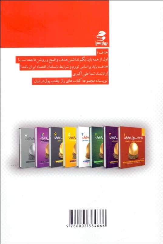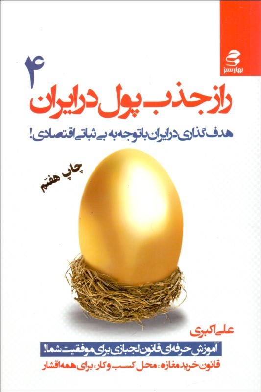 کتاب «راز جذب پول در ايران – جلد چهارم» نوشته علي اکبري است. موضوع اين کتاب هدفگذاري در ايران با توجه به بيثباتي اقتصادي است. شما در اين کتاب قانون خريد مغازه «محل کسب و کار» براي همه اقشار کاسب را ميآموزيد. اين کتاب داراي سه بخش با اين عناوين است: يک داستان واقعي براي پولدار شدن جنابعالي؛ آموزش اصول کسبوکار به سبک ايراني؛ و به آينده خوشآمديد.