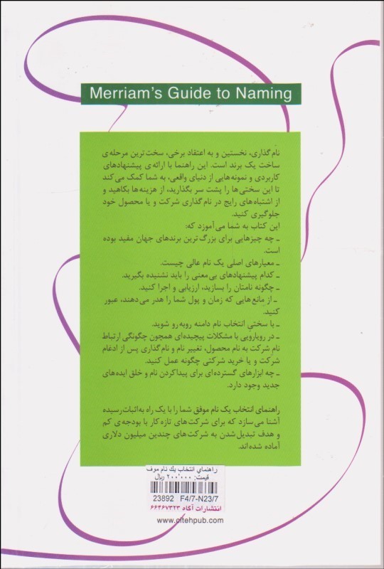 کتاب راهنماي انتخاب يک نام موفق که نخستين کتاب ترجمه شده به زبان فارسي در اين حوزه است، به ارائهي ابزارهاي خلاقانه و توصيههاي کاربردي براي انتخاب نام پرداخته است. اين راهنما با ارائهي پيشنهادهاي کاربردي و نمونههايي از دنياي واقعي، به شما کمک ميکند تا اين سختيها را پشت سر بگذاريد از هزينهها بکاهيد و از اشتباههاي رايج در نامگذاري شرکت و يا محصول خود جلوگيري کنيد.