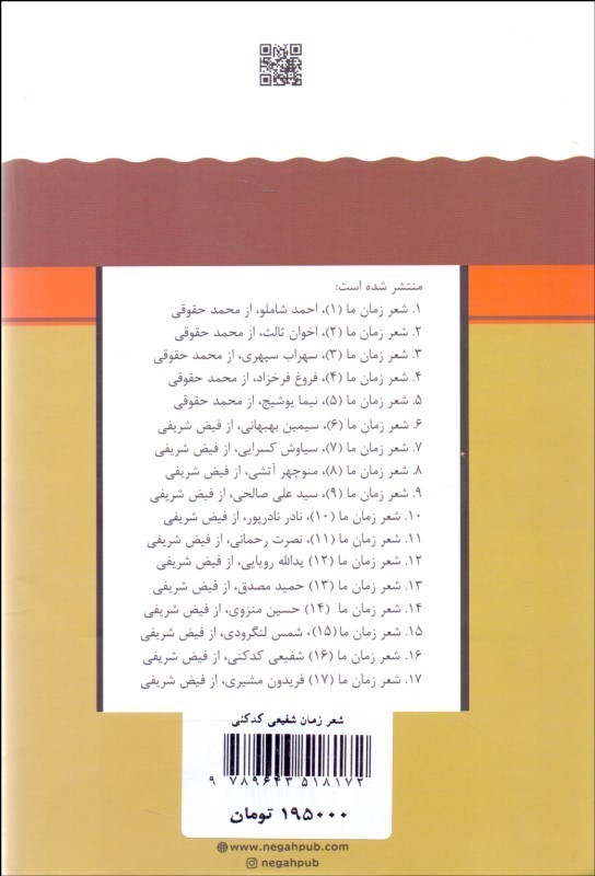شعر زمان ما 16 (محمدرضا شفيعي كدكني) ناشر: نگاه نويسنده: فيض شريفي قطع: رقعي نوع جلد: شوميز زبان: فارسي تعداد صفحات: 408 سال انتشار: 1399 نوبت چاپ: 3 وزن: 460 شابک: 9789643518172 قيمت: 195,000تومان موجودي : موجود نیست به من اطلاع بده افزودن به علاقهمندیها به اشتراک بگذارید نظرات محل درج نظر کاربران... کتابهای مرتبط با موضوع کتاب نشانهشناسي (نظريه و عمل) 295,000تومان گزيده اشعار خاقاني شرواني 320,000تومان 20% شاعر آينهها (بررسي سب... 350,000تومان 280,000تومان كندوكاوي در پارهاي از... 8,000تومان 20% چگونه شعر بخوانيم 265,000تومان 212,000تومان 20% يادداشتهايي درباره كافكا 90,000تومان 72,000تومان بيان و معاني 250,000تومان حماسه رستم و سهراب 360,000تومان تاريخ ادبيات ايران و ق... 310,000تومان كتاب كار نگارش و انشا 2 200,000تومان همراه اين کتاب خريداری شده راهنماي نگارش علمي 1384 13,000تومان مباني زيباشناسي 180,000تومان انديشه يونگ 195,000تومان قصهدرماني (نقش قصه در... 150,000تومان از واژه تا فرهنگ 120,000تومان از واج تا جمله فرهنگ ز... 300,000تومان البته واضح و مبرهن است... 245,000تومان درآمدي بر جامعهشناسي... 152,000تومان كليله و دمنه 180,000تومان كژتابيهاي ذهن و زبان 290,000تومان زبان و زبانشناسي 9,000تومان ميناگر عشق (شرح موضوعي... 980,000تومان در جستجوي نيشابور (زند... 68,000تومان قصهنويسي 295,000تومان آسيبشناسي رواني زندگي... 215,000تومان