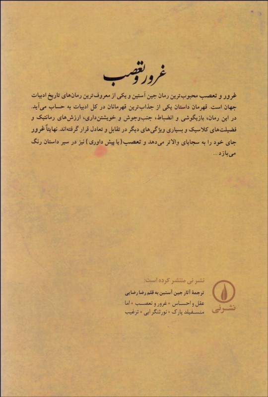 غرور و تعصب محبوبترين رمان جين آستين و يکي از معروفترين رمانهاي تاريخ ادبيات جهان است. قهرمان داستان يکي از جذابترين قهرمانان در کل ادبيات به حساب ميآيد. در اين رمان، بازيگوشي و انضباط، جنبوجوش و خويشتنداري، ارزشهاي رمانتيک و فضيلتهاي کلاسيک و بسياري ويژگيهاي ديگر در تقابل و تعادل قرار گرفتهاند. نهايتاً غرور جاي خود را به سجاياي والاتر ميدهد و تعصب (يا پيشداوري) نيز در سير داستان رنگ ميبازد...