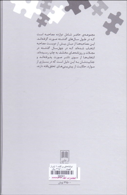 نوشتههاي پراكنده 7 (دوازده گفتگو) ناشر: علمي نويسنده: كورش صفوي قطع: رقعي نوع جلد: گالينگور زبان: فارسي تعداد صفحات: 120 سال انتشار: 1398 نوبت چاپ: 1 وزن: 270 شابک: 9789644044489 قيمت: 39,500تومان موجودي : موجود نیست به من اطلاع بده افزودن به علاقهمندیها به اشتراک بگذارید نظرات محل درج نظر کاربران...